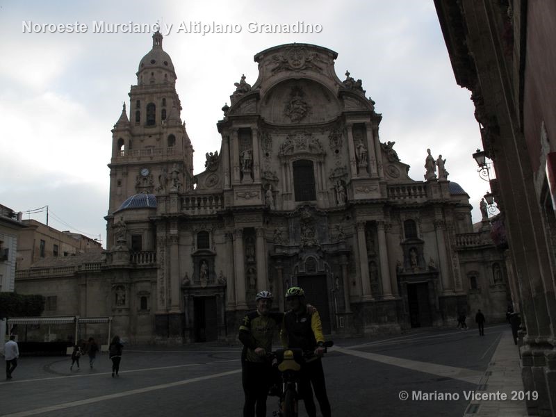 Son poco más de las ocho de esta bonita mañana de primavera, mientras pedaleamos en busca del tranvía que nos dejará al comienzo de la Vía Verde del Noroeste. Acabamos de hacernos una foto frente al imafronte de la catedral como prueba y testigo del inicio de nuestro viaje. Por comodidad hemos optado por subir al tranvía, cosa fácil y económica, aunque a estas horas de la mañana va cargado de estudiantes hacia la universidad y de madres con los niños a los colegios, pero nos ahorra un montón de tráfico y nos deja al comienzo de la vía verde del Noroeste en el campus de la universidad de Murcia.