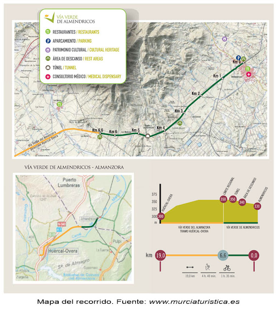 Las Vías Verdes son antiguos trazados ferroviarios en desuso acondicionados y transformados en itinerarios ecoturisticos. Por su propia indiosincracia son de suave pendiente lo que las hace accesibles para todo el mundo, están alejadas del tráfico motorizado, por lo que son seguras. Desde ellas se puede descubrir rico entorno natural y cultural de los territorios y poblaciones por las que pasan. Este nuevo tramo tiene una longitud de 6.5 km. desde la vieja estación de Almendricos -hoy solo un apeadero-, hasta el límite provincial con Almería. En estos pocos kilómetros, bordea la Sierra de Enmedio -espacio protegido de interés comunitario-, atravesando varios ramblizos, un falso túnel y algunos viejos cortijos abandonados. Se han plantado esquejes de algarrobos y pinos -desgraciadamente algunos ya están secos- para proporcionar sombra en los días de canícula y algunas áreas de descanso.