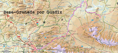 La primera jornada entre Lorca y Baza presenta dos posibilidades de recorrido totalmente distintos; el primero, en constante subida desde Lorca, se dirige hacia Vélez Blanco y María para tras pasar por Orce llegar a Baza. El segundo por el sur, hacia Albox; es un poco más corto, apenas unos kilómetros, y tiene algo menos de desnivel, por lo que será posiblemente el elegido, aunque probablemente el tráfico sea peor. Los dos rondan los 150 kilómetros por lo que la distancia no será determinante. La cosa se complica entre Baza y Granada. El recorrido natural es por Guadix, pero lo ocupa la A-92 y alternativas hay pocas. En principio solo he visto una que forma una gran ese; se va hacia el norte por la carretera de Pozo Alcon, para al llegar al embalse del Negratín, girar hacia el sur formando un gran arco que atraviesa la autovía pasado Guadix, para girar de nuevo hacia el oeste, hacia las estribaciones de Sierra Nevada entrando en Granada por el sur. Una variante de esta, y que tiene muchas posibilidades, es la que en Huélago, continua hacia el oeste por la A-308 y entra en Granada por el norte, igual distancia pero con algo más de desnivel.