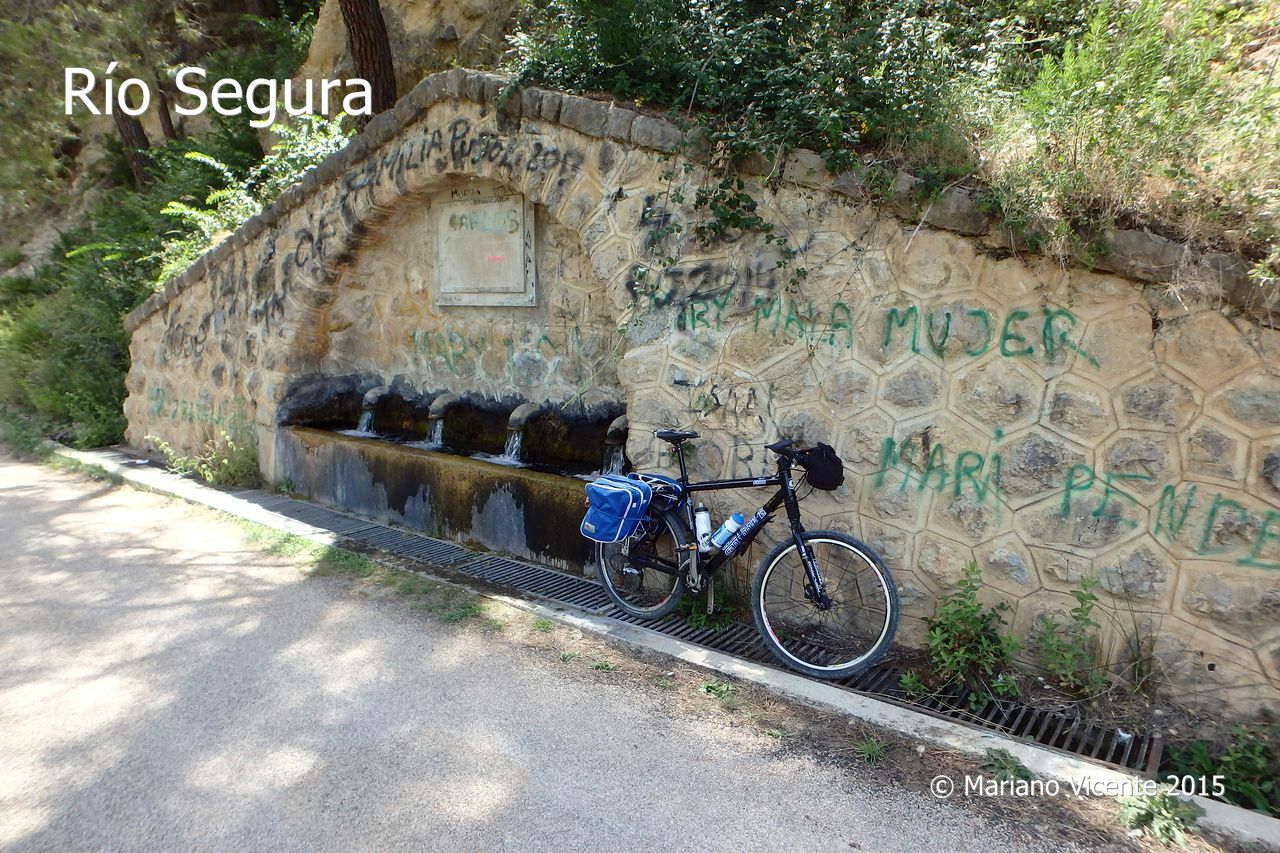 Lunes, 6 de julio, son las 12 de la mañana, Fuente Segura mana laxa, con un rumor apagado, nada que ver con la fuerza y el bramar de la vez anterior. Hace calor, aunque soportable. Y como hace catorce años comenzamos la subida en dirección a Santiago de la Espada para tomar la pista que nos dejará en la Toba. La carretera se muestra listada por la sombra de los olmos en estas horas de la mañana.